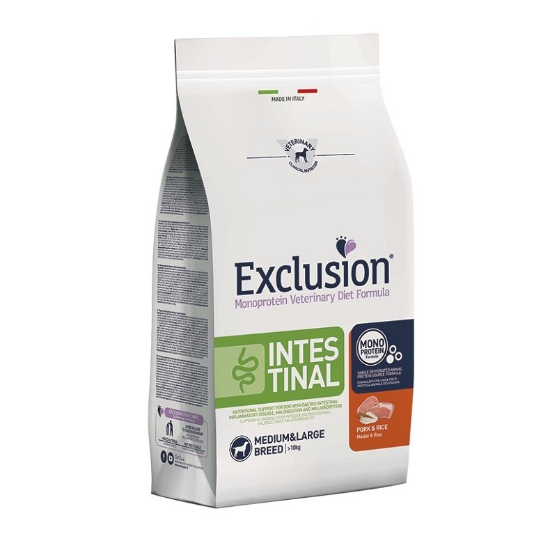 Exclusion Monoprotein Veterinary Diet Formula Intestinal è un alimento dietetico con formulazione monoproteica, realizzato con un’unica fonte alternativa di proteine animali, ingredienti innovativi e preservato con tocoferoli naturali; rappresenta la risposta nutrizionale a disposizione del Veterinario, differenziata per taglia, come supporto nutrizionale per cani con patologie gastrointestinali, maldigestione e malassorbimento.