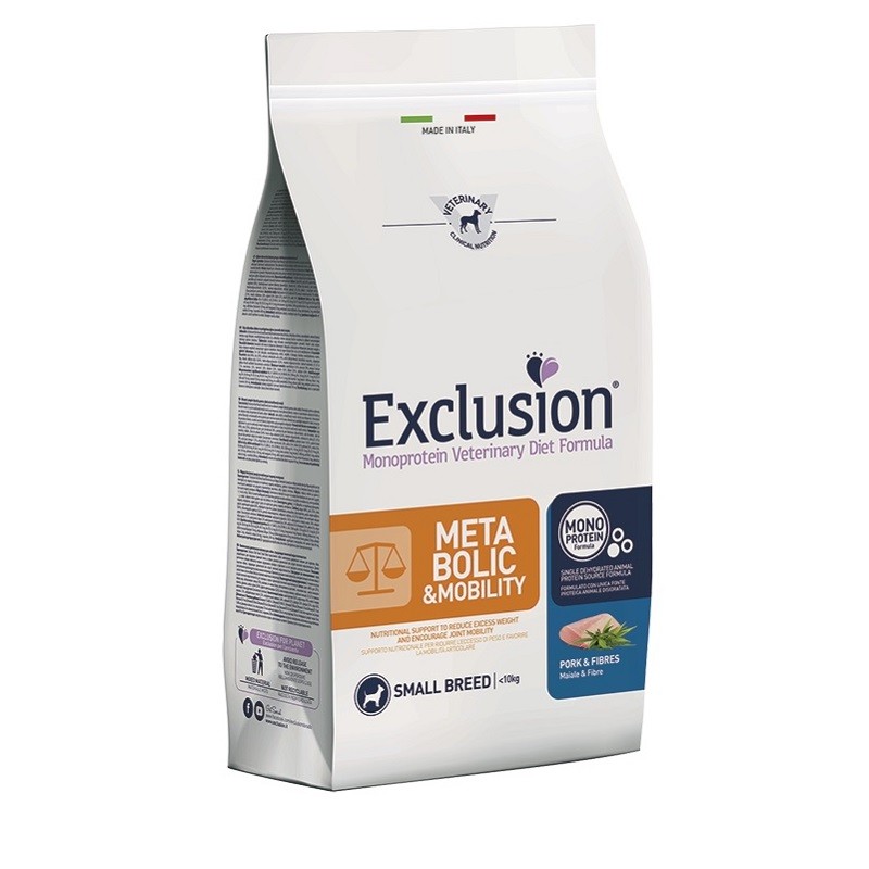 Exclusion Monoprotein Veterinary Diet Formula Metabolic & Mobility un alimento dietetico con formulazione monoproteica, realizzato con un’unica fonte alternativa di proteine animali, ingredienti innovativi e preservato con tocoferoli naturali; rappresenta la risposta nutrizionale a disposizione del Veterinario, differenziata per taglia, come supporto nutrizionale per ridurre l’eccesso di peso e favorire la mobilità articolare.