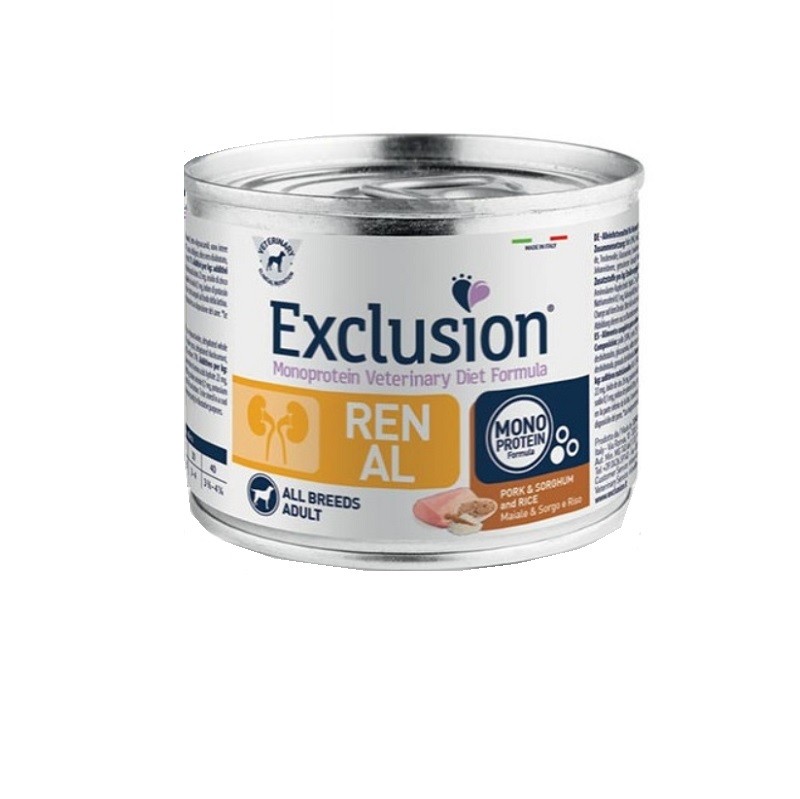 Exclusion Monoprotein Veterinary Diet Formula Renal è un alimento dietetico con formulazione monoproteica, realizzato con un’unica fonte alternativa di proteine animali, ingredienti innovativi e preservato con tocoferoli naturali; rappresenta la risposta nutrizionale a disposizione del Veterinario, differenziata per taglia, come supporto nutrizionale della funzionalità renale in corso di insufficienza renale cronica o temporanea.
