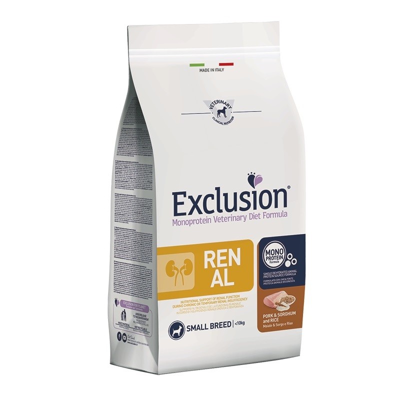 Exclusion Monoprotein Veterinary Diet Formula Renal è un alimento dietetico con formulazione monoproteica, realizzato con un’unica fonte alternativa di proteine animali, ingredienti innovativi e preservato con tocoferoli naturali; rappresenta la risposta nutrizionale a disposizione del Veterinario, differenziata per taglia, come supporto nutrizionale della funzionalità renale in corso di insufficienza renale cronica o temporanea.