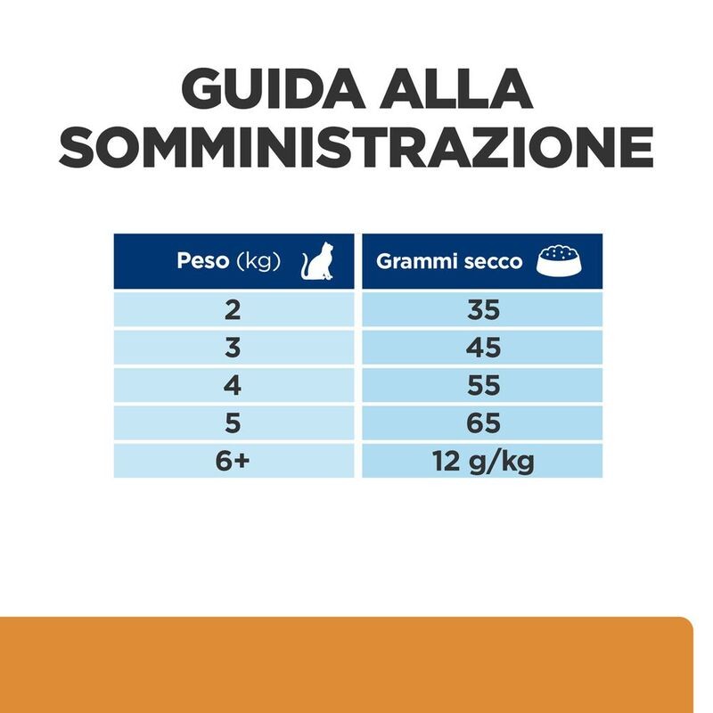 Questi dosaggi sono da considerarsi indicativi, in quanto le esigenze dei gatti cambiano. Adattare le dosi al fine di mantenere il peso corporeo ideale.