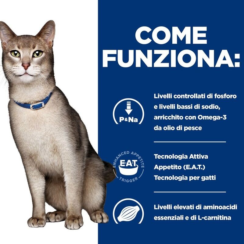 - Con la Tecnologia Enhanced Appetite Trigger (E.A.T.)™ che stimola l’appetito dei gatti con patologie renali, determinando un apporto calorico del 35% superiore rispetto ad altre diete renali sul mercato