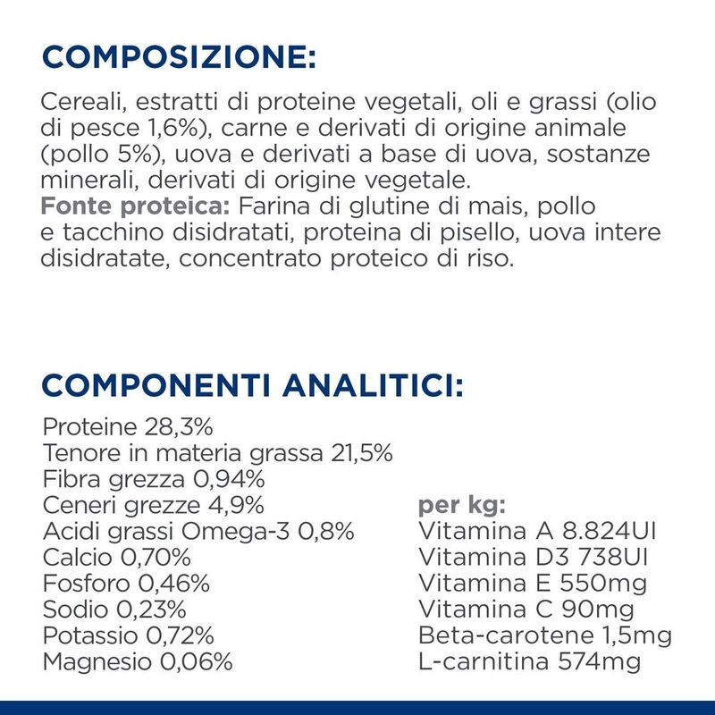 COMPONENTI ANALITICI: Proteine 28,1%, Tenore in materia grassa 21,6%, Acidi grassi essenziali 4,2%, Acidi grassi Omega-3 0,8%, Fibra grezza 1,0%, Ceneri grezze 4,9%, Calcio 0,73%, Fosforo 0,46%, Sodio 0,24%, Potassio 0,71%, Magnesio 0,06%; per kg: Vitamina A 9.077UI, Vitamina D3 919UI, Vitamina E 550mg, Vitamina C 90mg, Beta-carotene 1,5mg, L-carnitina 518mg.