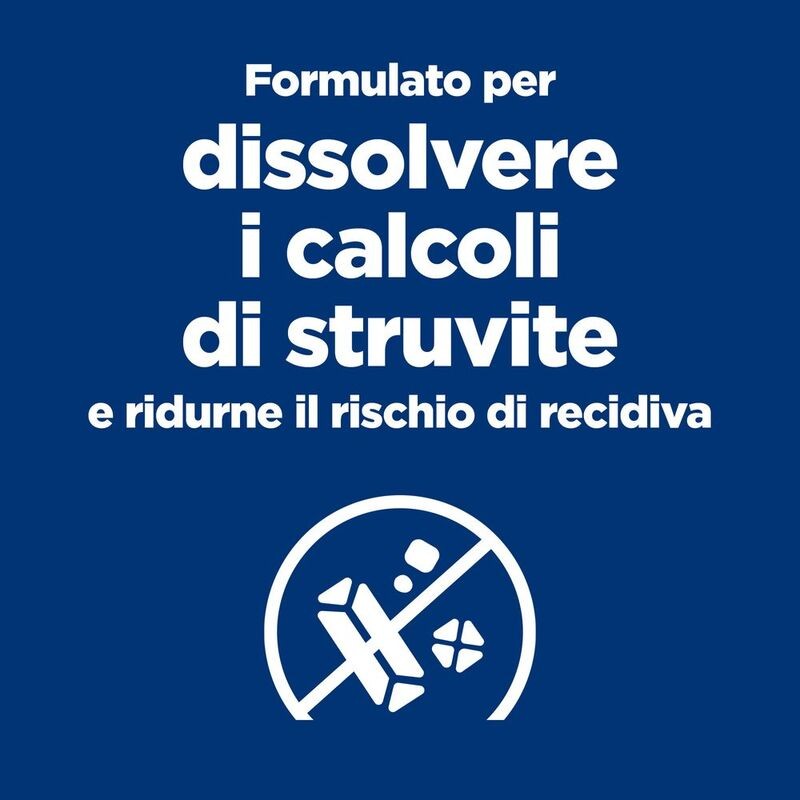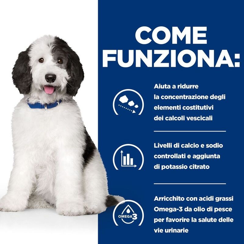 Hill’s PRESCRIPTION DIET c/d Multicare alimento per cani con pollo è un alimento dietetico completo per la riduzione delle recidive dei calcoli di struvite, per la dissoluzione dei calcoli di struvite e per la riduzione della formazione dei calcoli di ossalato nei cani adulti. Questo alimento ha proprietà di sottosaturazione urnaria per la struvite, proprietà alcalinizzanti le urine e bassi livelli di magnesio, calcio e vitamina D.