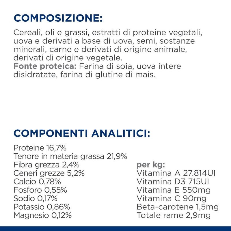 COMPONENTI ANALITICI: Proteine 16,4%, Tenore in materia grassa 21,8%, Acidi grassi essenziali 4,71%, L-arginina 1,17%, Fibra grezza 2,3%, Ceneri grezze 5,1%, Calcio 0,72%, Fosforo 0,56%, Sodio 0,18%, Potassio 0,86%, Magnesio 0,12%; per kg: Vitamina A 26.478UI, Vitamina D3 713UI, Vitamina E 550mg, Vitamina C 90mg, Beta-carotene 1,5mg, L-carnitina 314mg, Totale zinco 158mg, Totale rame 2,9mg.