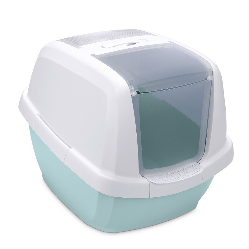 Lettiera maddy adatta anche a gatti di grossa taglia, portina ribaltabile per facilitare la pulizia interna, pedana di appoggio per agevolare l’entrata e l’uscita, filtro ai carboni