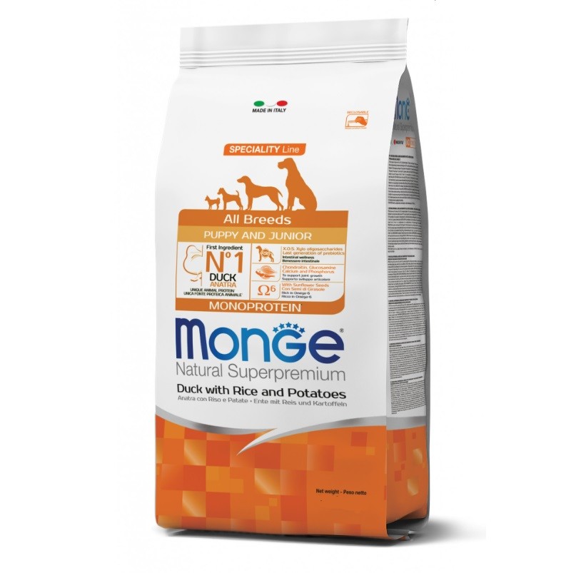 Monge Natural Superpremium All breeds Puppy and Junior Monoprotein* Anatra con Riso e Patate è un alimento completo per cani cuccioli di tutte le taglie. Prodotto formulato con un’unica fonte proteica animale*, l’anatra e con l’inclusione di carne fresca per una digeribilità e appetibilità ottimale. La ricetta è arricchita con prebiotici di ultima generazione xilo-oligosaccaridi (XOS) e riso integrale per il supporto del benessere intestinale e con ingredienti superfood come i semi di girasole, naturalmente ricchi di omega-6 e vitamina E. La formulazione contiene inoltre glucosamina e solfato di condroitina per il supporto dello sviluppo articolare e un bilanciato rapporto calcio/fosforo per un regolare accrescimento delle ossa e delle articolazioni del cucciolo.
