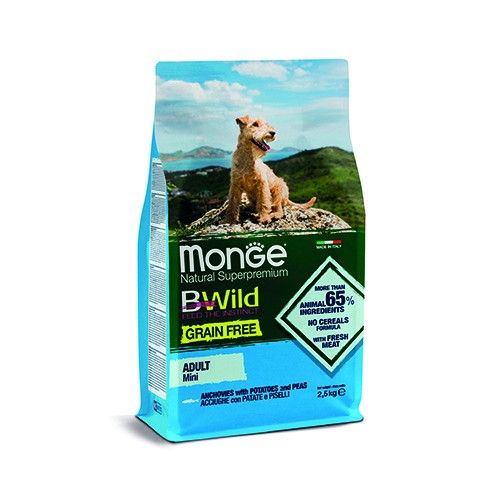 Monge Natural SuperPremium Grain Free prodotto formulato con acciughe, patate e piselli è un alimento completo e bilanciato per cani adulti di piccola taglia.