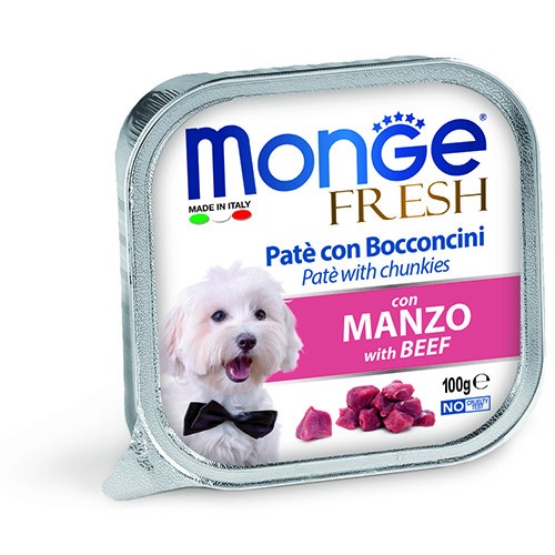 Il delizioso paté con prelibati bocconcini di manzo fresco è un alimento completo selezionato per supportare ogni giorno il benessere quotidiano del vostro animale. La ricetta è stata formulata con un basso tenore di zuccheri e senza grassi idrogenati. Il gustoso e morbido paté con bocconcini è ideale per cani di piccola taglia e come premio per cani più grandi. Monge Fresh è Made in Italy, No Cruelty Test e senza coloranti e conservanti.
