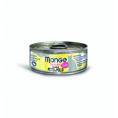 MONGE DELICATE PETTO DI POLLO è un alimento complementare per gatti adulti, preparato con cura e dal gusto delicato grazie alla sua cottura a vapore.