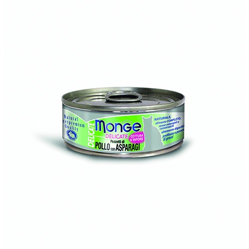 MONGE DELICATE POLLO CON ASPARAGI è un alimento complementare per gatti adulti, preparato con cura e dal gusto delicato di pollo grazie alla sua cottura a vapore.
