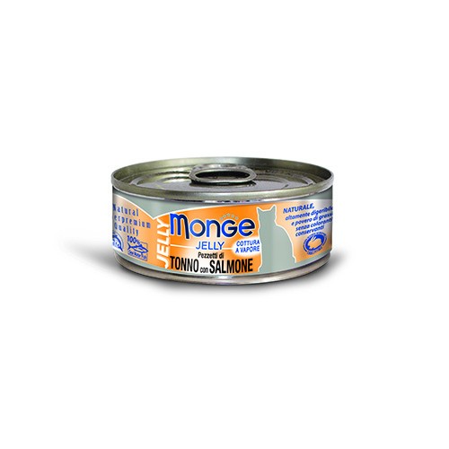 MONGE JELLY TONNO CON SALMONE è un alimento complementare per gatti adulti, preparato con una deliziosa e delicata gelatina e cotto a vapore.