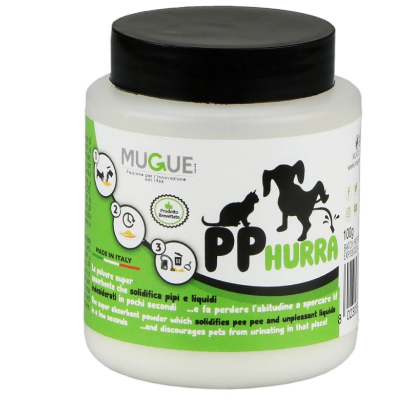PP Hurrà fa parte della linea PP di Mugue, una serie di prodotti Pet Friendly e made in Italy, UNICI, INNOVATIVI e BREVETTATI che aiutano i proprietari di cani e gatti a risolvere, in pochi secondi, problemi inerenti a pipì e altri liquidi sgraditi (vomito etc.) in casa e fuori casa.