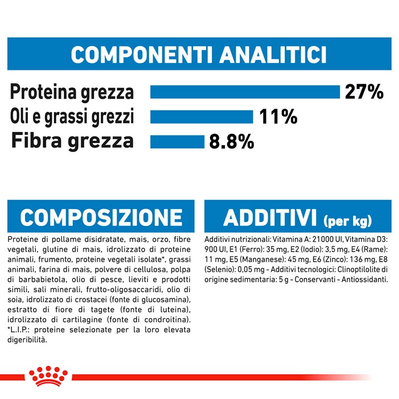 COMPOSIZIONE: proteine di pollame disidratate, fibre vegetali, mais, orzo, farina di mais, glutine di mais, proteine vegetali isolate*, idrolizzato di proteine animali, frumento, grassi animali, polpa di barbabietola, polvere di cellulosa, olio di pesce, sali minerali, lieviti e prodotti simili, frutto-oligosaccaridi, tegumento e semi di psyllium, olio di soia, idrolizzato di crostacei (fonte di glucosamina), estratto di fiore di tagete (fonte di luteina), idrolizzato di cartilagine (fonte di condroitina).