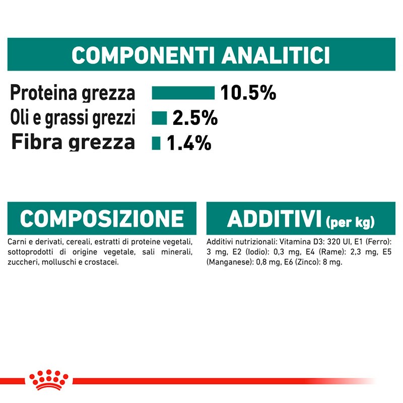 COMPOSIZIONE: carni e derivati, cereali, estratti di proteine vegetali, sottoprodotti di origine vegetale, sali minerali, zuccheri, molluschi e crostacei. ADDITIVI (per kg): Additivi nutrizionali: Vitamina D3: 320 UI, E1 (Ferro): 3 mg, E2 (Iodio): 0,3 mg, E4 (Rame): 2,3 mg, E5 (Manganese): 0,8 mg, E6 (Zinco): 8 mg. COMPONENTI ANALITICI: Proteina grezza: 10,5% – Oli e grassi grezzi: 2,5% – Ceneri grezze: 1,1% – Fibra grezza: 1,4% – Umidità : 80,5% – Fosforo: 0,15%. ISTRUZIONI PER L’USO: vedi tabella. Da consumarsi preferibilmente entro/n° di lotto/n° di identificazione dello stabilimento: vedi informazioni sulla confezione. Da conservare in un luogo fresco ed asciutto.
