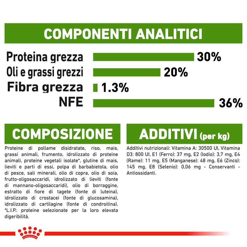 COMPOSIZIONE: proteine di pollame disidratate, riso, mais, grassi animali, frumento, idrolizzato di proteine animali, proteine vegetali isolate*, glutine di mais, lieviti e prodotti simili, polpa di barbabietola, olio di pesce, sali minerali, olio di copra, olio di soia, frutto-oligosaccaridi, idrolizzato di lieviti (fonte di mannano-oligosaccaridi), olio di borraggine, estratto di fiore di tagete (fonte di luteina), idrolizzato di crostacei (fonte di glucosamina), idrolizzato di cartilagine (fonte di condroitina). ADDITIVI (per kg): Additivi nutrizionali: Vitamina A: 30500 UI, Vitamina D3: 800 UI, E1 (Ferro): 37 mg, E2 (Iodio): 3,7 mg, E4 (Rame): 11 mg, E5 (Manganese): 48 mg, E6 (Zinco): 145 mg, E8 (Selenio): 0,06 mg – Conservanti – Antiossidanti. COMPONENTI ANALITICI: Proteina grezza: 30% – Oli e grassi grezzi: 20% – Ceneri grezze: 7,2% – Fibra grezza: 1,3% – EPA/DHA: 4 g/kg. ISTRUZIONI PER L’USO: vedi tabella. Da consumarsi preferibilmente entro/n° di lotto/n° di identificazione dello stabilimento: vedi informazioni sulla confezione. Da conservare in un luogo fresco ed asciutto. *L.I.P.: proteine selezionate per la loro elevata digeribilità.